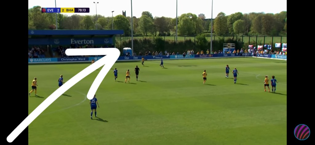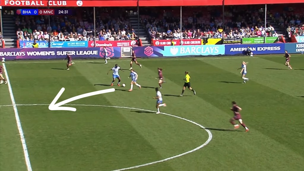 Equally, Agyemang is a good outlet to receive long and high balls. When she started on the left in the away fixtures against Everton and Aston Villa she was an outlet to receive long balls and maintain possession by breaking through the first line of the press. Indeed, Brighton produced a long raking cross field ball to Agyemang a total of eight times in the first half alone showing how she is used a valve to release the pressure at the back. This is a trend that happened in any game she played.
